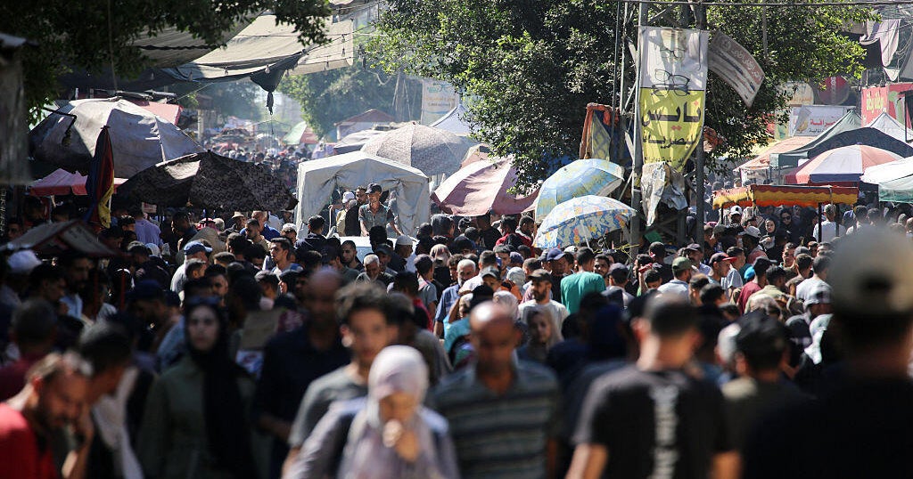 فلسطینی ها بیش از یک هفته پس از توافق آتش بس میان اسرائیل و حماس، در ۱۸ اکتبر ۲۰۲۵، در بازاری در دیرالبلاح در مرکز نوار غزه تجمع کردند.